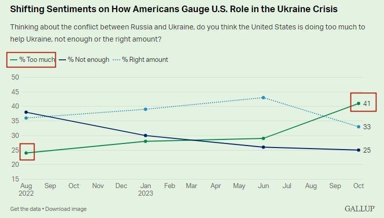 盖洛普咨询公司上周公布的一项民调显示,支持向乌克兰提供额外援助的美国人正越来越少,41%的受访者认为美国在援乌方面“做得太多”;而在三个月前,这个比例还只有24%。