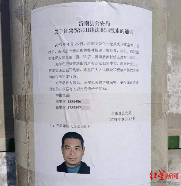 贺法田有案底。2023年9月,王泉村的电线杆上,张贴着沂南县公安局征集杀人嫌犯贺法田犯罪线索的通告。贺法田在10月31日接受审判时,曾经的案件、曾经被他伤害的人,成了本案的证据、证人。