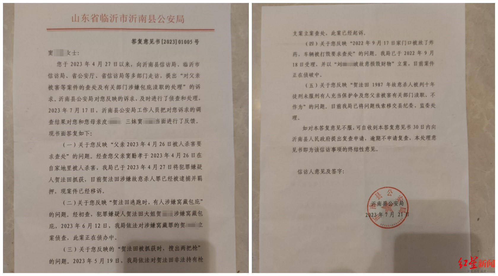 对此,山东省临沂市沂南县公安局在2023年7月出具的答复意见书中称,已对贺法田涉嫌故意杀人、非法持有枪支案立案,并将贺法田羁押移送起诉。今年6月,该局依法对涉嫌窝藏罪的贺法田大姐贺某某立案侦查,案件正在侦办中;对于家属反映“2022年9月17日家门口被放了炸药,车辆被打毁”的问题,该局已于2022年9月18日受理,并以“刘某被故意损毁财物”立案,目前案件正在侦破中;关于家属反映“贺法田1987年故意杀人被判十年徒刑未服刑,父亲被害有关部门渎职、不作为”的问题,该局已将问题线索移交县纪委、监委处理。