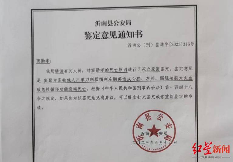 2023年5月15日,沂南县公安局出具的《鉴定意见通知书》显示,经鉴定,窦勤孝的死亡原因系被他人用单刃刺器捅刺左胸部造成心脏、左肺、膈肌破裂大失血致急性循环功能衰竭死亡。