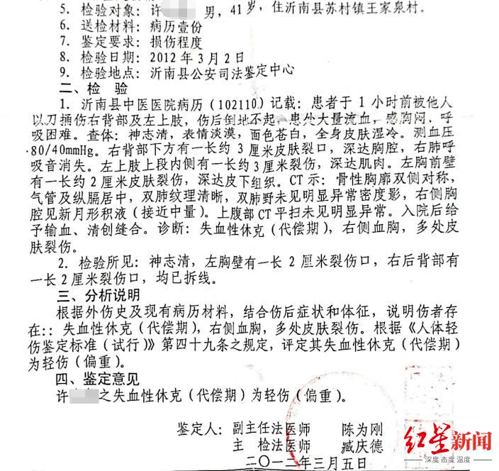 红星新闻记者从窦勤孝家属提供的相关材料了解到,2012年,许某的弟弟和残疾的母亲发现他们家地里快成熟的花生连续几年被贺法田拔掉。许某回家后听说此事,就前去劝说老邻居贺法田,不料贺法田拔刀把许某捅伤。沂南县公安局出具的法医学人体损伤程度鉴定书显示,许某存在失血性休克(代偿期)、右胸血胸、多处皮肤裂伤的症状,鉴定意见为许某为轻伤(偏重)。