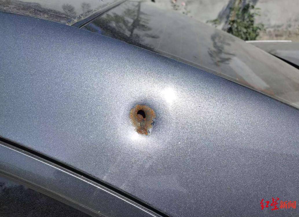 ▲刘某车辆被不明物品打出一个洞(陈卿媛 摄)