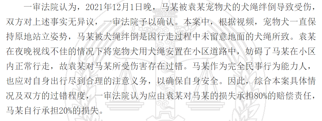 一审法院认为,2021年12月1日晚,马大妈被袁某宠物犬的犬绳绊倒导致受伤,双方对上述事实无异议,一审法院予以确认。本案中,根据视频,宠物犬一直保持原地站立姿势,马大妈被犬绳绊倒是因行走过程中未留意地面的犬绳所致。袁某在夜晚视线不佳的情况下将宠物犬用犬绳安置在小区道路中,妨碍了马大妈在小区内正常行走,故袁某对马大妈所受伤害存在过错。