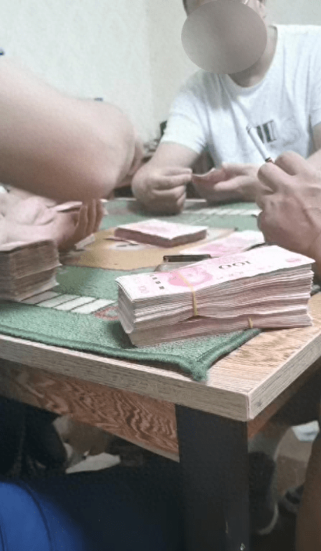 澎湃新闻记者从视频中发现,现场有五六个人围坐在牌桌边,其中一人正在发扑克。牌桌上摆着多叠百元现金,至少有数万元。