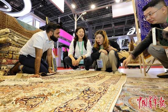 11月6日,上海国家会展中心,第六届中国国际进口博览会消费品展区,来自伊朗的波斯地毯以其精美的图案、细腻的质感受到参观者的喜爱。中青报·中青网记者 李建泉/摄