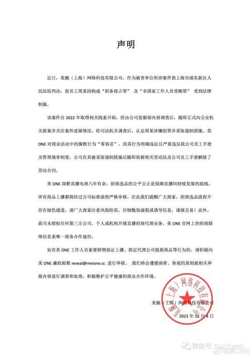 美腕(上海)网络科技有限公司是主播李佳琦公司的运营方。美腕今日发布声明,称前员工周某因构成“职务侵占罪”、“非国家工作人员受贿罪”受到法律制裁。