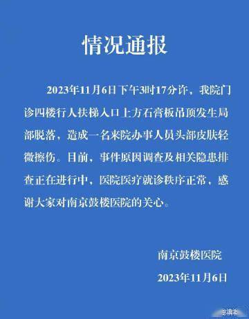 11月6日,网传南京鼓楼医院天花板掉落。南京消防支队此前回应称,已到现场处置,无人员被困。南京鼓楼医院发布情况通报:2023年11月6日下午3时17分许,我院门诊四楼行人扶梯人口上方石膏板吊顶发生局部脱落,造成一名来院办事人员头部皮肤轻微擦伤。目前,事件原因调查及相关隐患排查正在进行中,医院医疗就诊秩序正常,感谢大家对南京鼓楼医院的关心。
