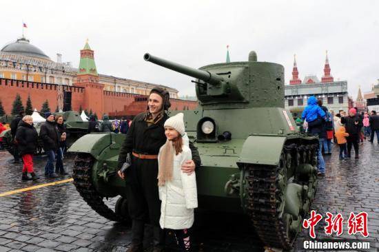 11月6日,在俄罗斯首都莫斯科,人们在红场参观以纪念1941年苏联红场阅兵式为主题的露天展览。俄罗斯于11月5日至7日在红场举办活动,纪念1941年苏联红场阅兵式。1941年11月7日,在德国法西斯军队兵临莫斯科城下之际,苏联军队在红场举行阅兵式。受阅部队在阅兵完毕后直接开赴前线同入侵的法西斯德军作战。中新社记者 田冰 摄