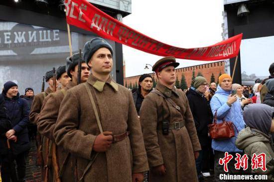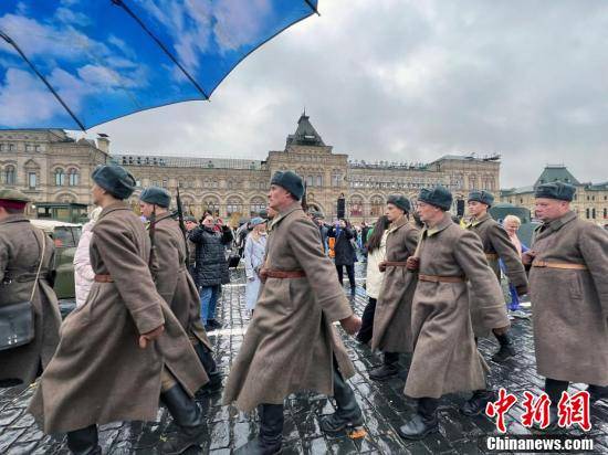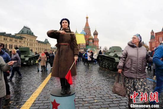 11月6日,在俄罗斯首都莫斯科,身穿二战时期苏军服装的演员队伍走过红场。俄罗斯于11月5日至7日在红场举办露天展览活动,纪念1941年苏联红场阅兵式。1941年11月7日,在德国法西斯军队兵临莫斯科城下之际,苏联军队在红场举行阅兵式。受阅部队在阅兵完毕后直接开赴前线同入侵的法西斯德军作战。中新社记者 田冰 摄