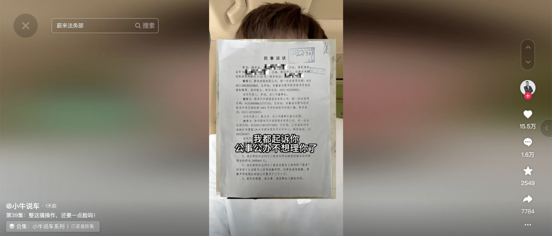 针对此事,蔚来董事长李斌公开回应称,“污蔑、抹黑蔚来用户,突破了我们的底线,一定会斗争到底”。随后,蔚来对“小牛说车”持有人顾某波提起诉讼,并获法院正式立案。