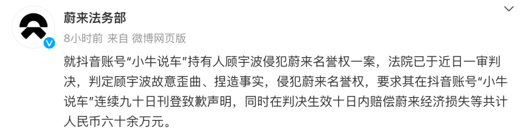 今日,蔚来汽车法务部在微博平台发文称:法院已于近日一审判决,判定顾宇波故意歪曲、捏造事实,侵犯蔚来名誉权,要求其在抖音账号“小牛说车”连续九十日刊登致歉声明,同时在判决生效十日内赔偿蔚来经济损失等共计人民币六十余万元。
