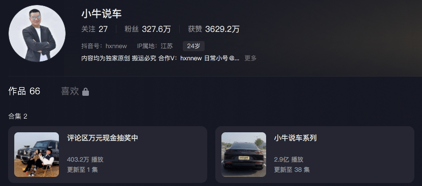 据了解,“小牛说车”一个自媒体账号,持有人为顾宇波,背后公司为江苏车邦人文化传播有限公司,成立于2021年8月,注册资本为1000万元。截至发稿,“小牛说车”共发布66个作品,粉丝数量为327.6万,获赞3629.2万次。