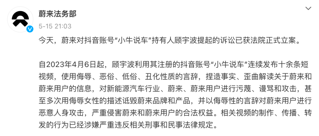 事情是这样的,今年5月,蔚来开通“蔚来法务部”微博账号,随后的15日,蔚来法务部发文称:“小牛说车”连续发布十余条短视频,使用侮辱、恶俗、低俗、丑化性质的言辞,捏造事实、歪曲解读关于蔚来和蔚来用户的信息,对新能源汽车行业、蔚来、蔚来用户进行污蔑、谩骂和攻击,甚至多次用侮辱女性的描述诋毁蔚来品牌和产品,并以侮辱性的言辞对蔚来用户进行恶意人身攻击,严重侵害蔚来和蔚来用户的合法权益。蔚来暂定要求其删除相关视频、公开赔礼道歉并赔偿500万元人民币。