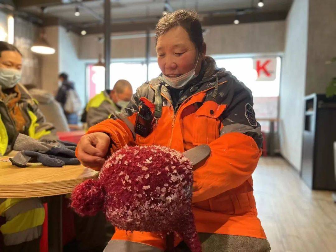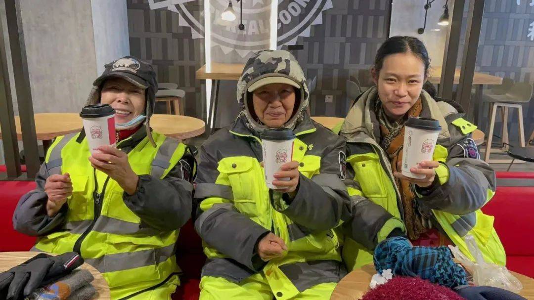 冬日里,环卫工人在风雪中连续作业,手脚冻僵,寒风吹得眼睛不断流泪。一杯热水对他们来说是一种问候、一种感谢。