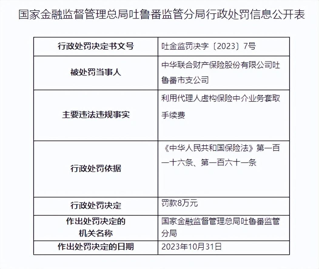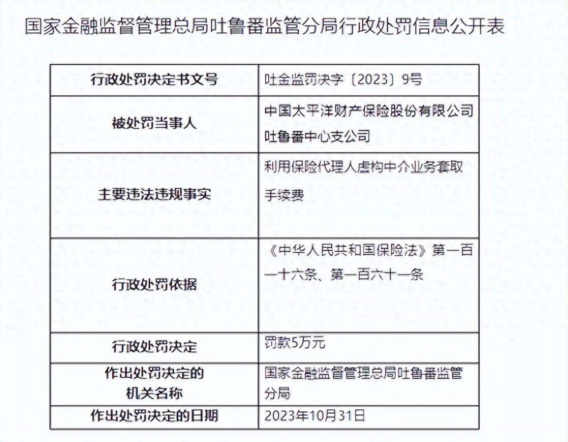 具体而言,因利用代理人虚构保险中介业务套取手续费,中华财险吐鲁番市支公司、太平洋产险吐鲁番中心支公司分别被罚8万元、5万元。