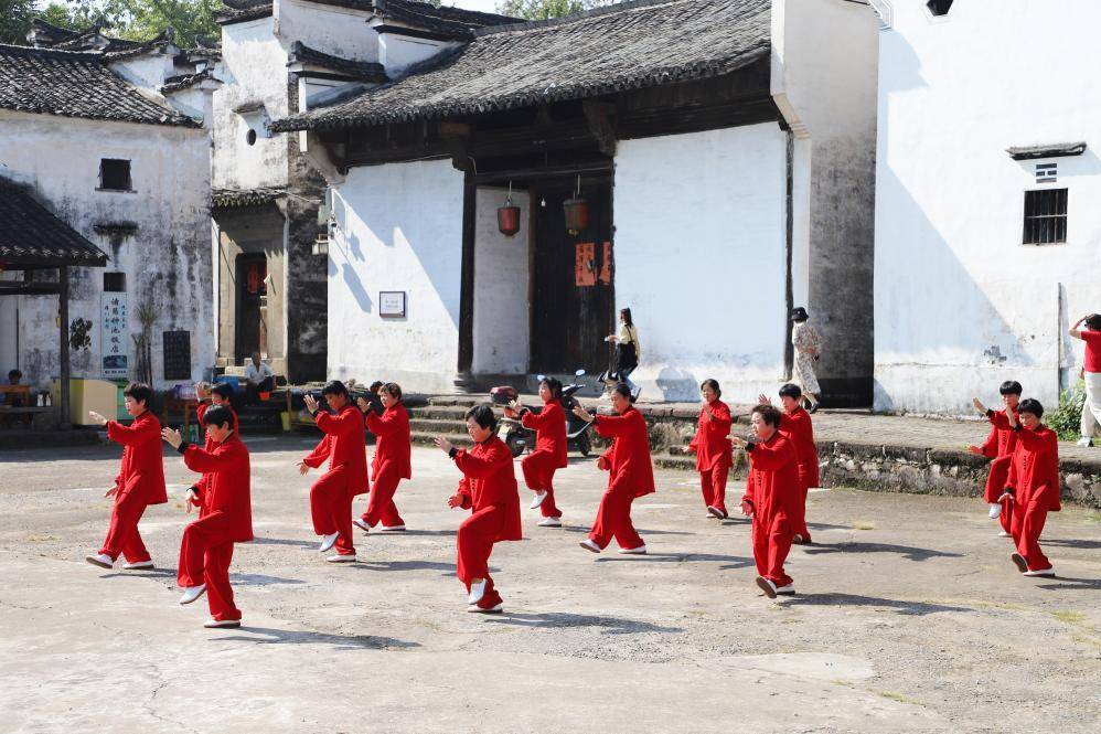 图为中老年人在诸葛村钟池池畔打太极拳。新华社记者张晓洁 摄