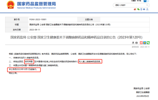 2023年9月6日,国家药品监督管理局、公安部、国家卫生健康委发布《关于调整麻醉药品和精神药品目录的公告》,将“依托咪酯”(在中国境内批准上市的含“依托咪酯”的药品制剂除外)列入第二类精神药品目录,自2023年10月1日起施行,非法吸食、持有、贩卖“依托咪酯”将按涉毒违法犯罪处理。