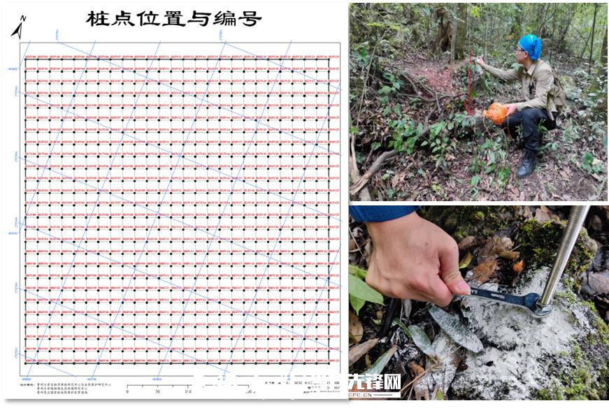 研究团队通过十余次野外调查,共计调查物种124科351属632种。其中,木本植物82科219属426种,以樟科植物为常见科植物,占据总调查物种的11.11%,共有9属28种。完成了样方选址、边界桩点埋设、网格桩点布设、植物物种调查、植物样方调查等相关工作。