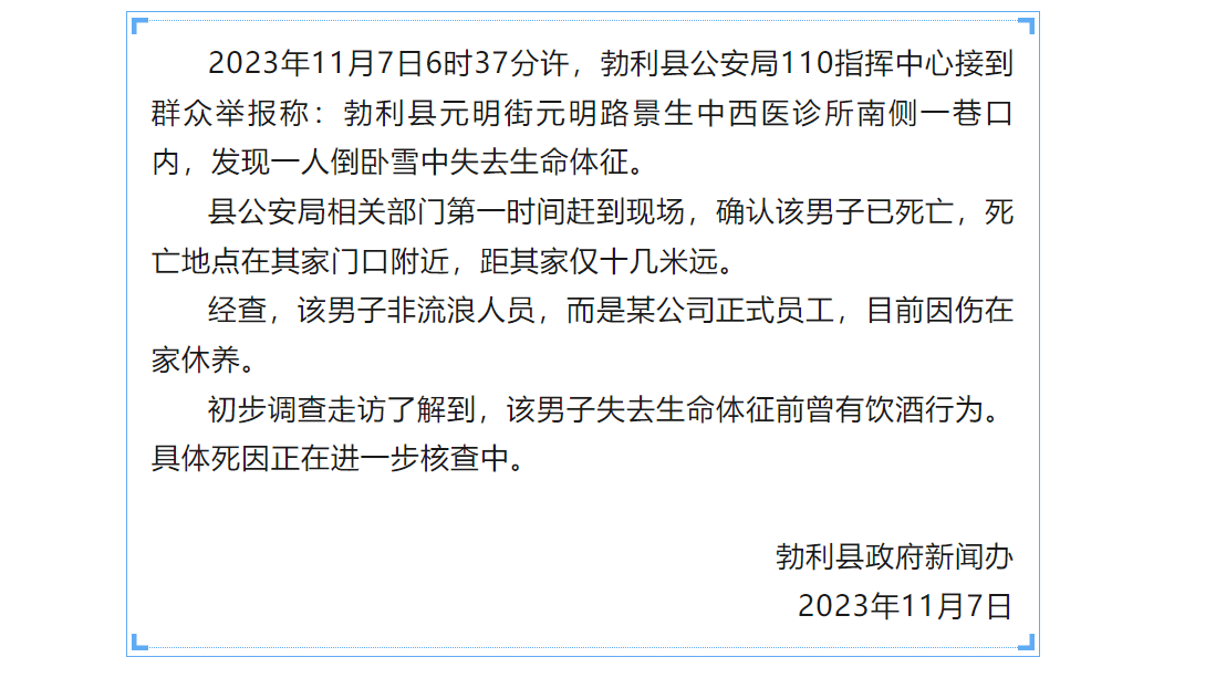 11月7日,“幸福勃利”微信公众号消息:11月7日6时37分许,勃利县公安局110指挥中心接到群众举报称:勃利县元明街元明路景生中西医诊所南侧一巷口内,发现一人倒卧雪中失去生命体征。