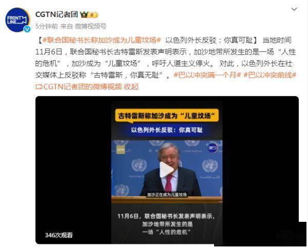 当地时间11月6日,联合国秘书长古特雷斯发表声明表示,加沙地带所发生的是一场“人性的危机”,加沙成为“儿童坟场”,呼吁人道主义停火。对此,以色列外长在社交媒体上反驳称“古特雷斯,你真无耻”。