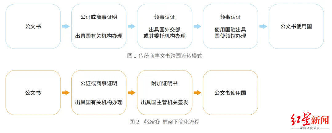 加入《公约》前,公文书送往国外使用,通常需办理领事认证(领事认证机构根据自然人、法人或其他组织的申请,对国内涉外公证书、其他证明文书或国外有关公文书上最后一个印鉴、签名的真实性予以确认的活动),而加入《公约》后,我国同其他缔约国之间不再需要办理使领馆领事认证,“双认证”将被简化为使用附加证明书的“一步式”证明手续,附加证明书与领事认证书具备同等效力,大大降低公文书跨国流转的时间和经济成本。