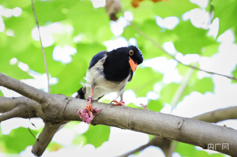 红嘴蓝鹊啄食花朵(央广网发 曾玉娟 供图)