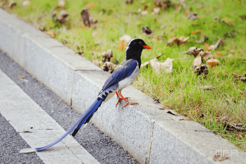 红嘴蓝鹊在道路旁悠闲踱步(央广网发 曾玉娟 供图)