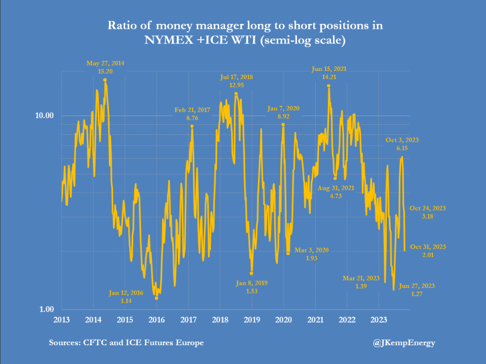 截至10月31日,总持仓从9月19日的6.8亿桶(2013年以来所有周的第64百分位)降至4.06亿桶(第18个百分位)。