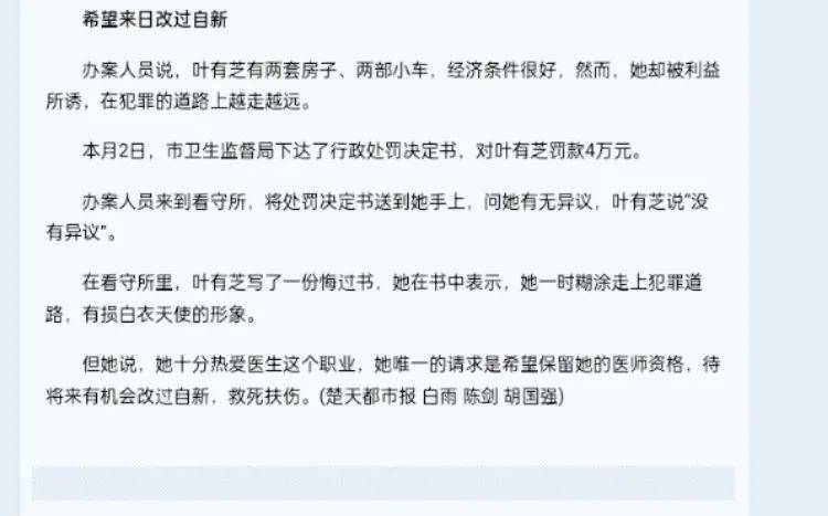 在看守所里,叶有芝写了一份悔过书,她在其中表示,她一时糊涂走上犯罪道路,有损白衣天使的形象。但她说,她十分热爱医生这个职业,她唯一的请求是希望保留她的医师资格,待将来有机会改过自新,救死扶伤。