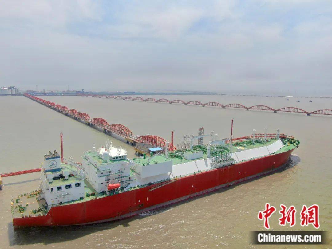 2021年5月,在江苏省如东县洋口港中石油江苏LNG接收站码头,来自阿尔及利亚的“科洛尼斯”LNG船正在接卸进口天然气。许丛军 摄
