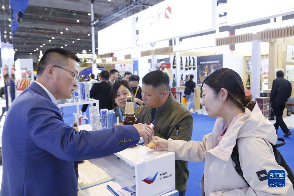11月7日,在第六届进博会食品及农产品展区俄罗斯出口中心展台,参观者品尝来自俄罗斯的波罗的海啤酒。