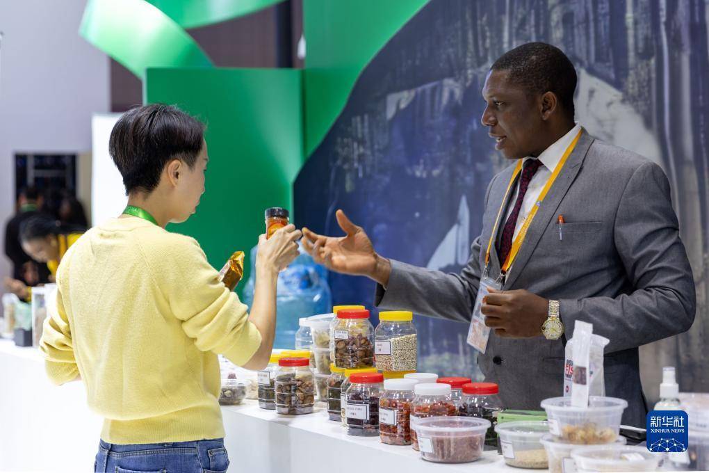 11月7日,在进博会国家馆尼日利亚馆,展商介绍尼日利亚产品。