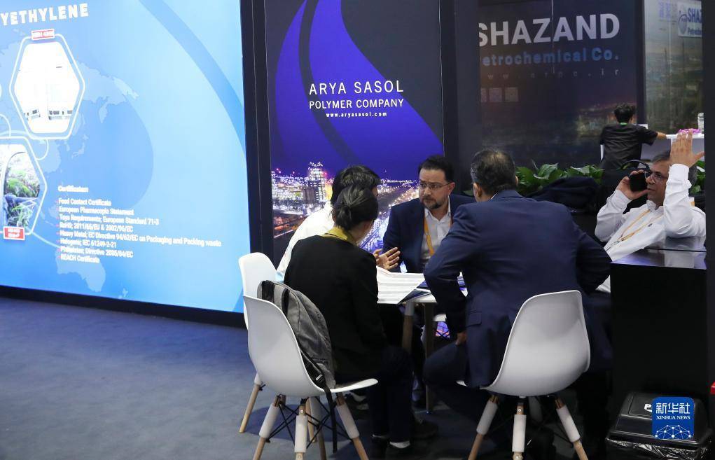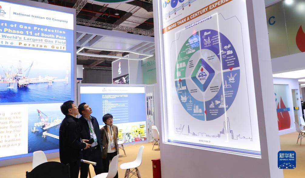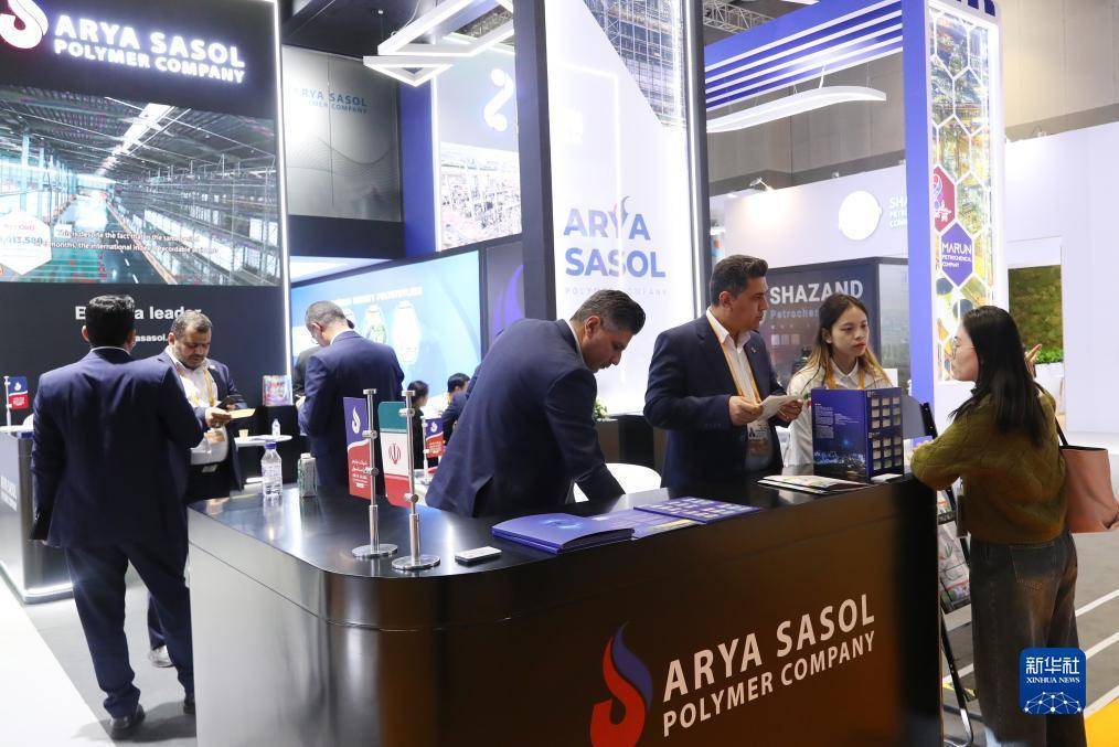 11月7日,参观者在第六届进博会技术装备展区的伊朗石油化学和工业公司展台边驻足观看。