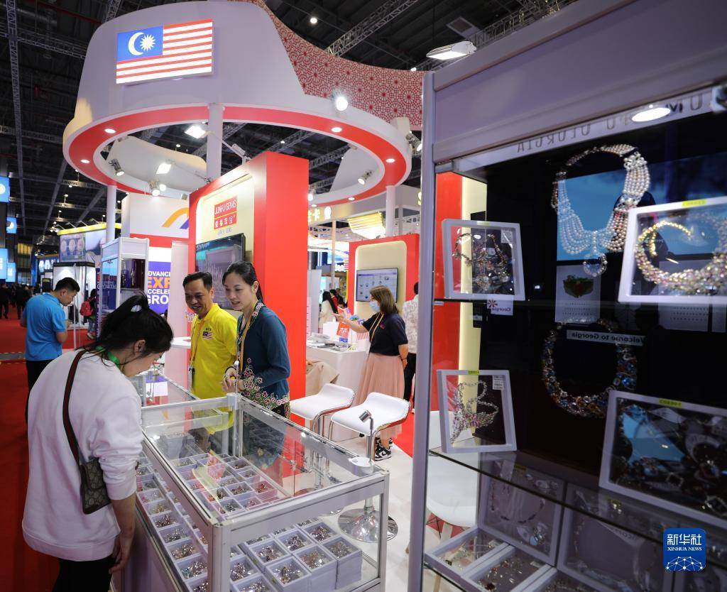 11月6日,参观者在第六届进博会国家展马来西亚展台欣赏展出的珠宝首饰。
