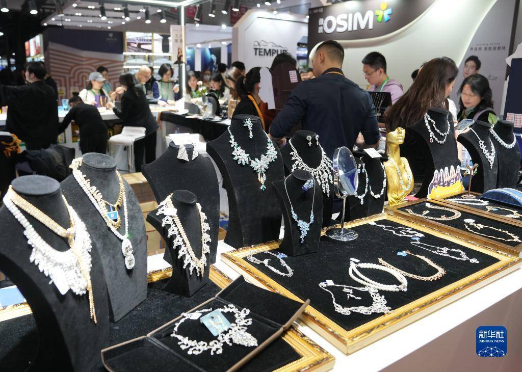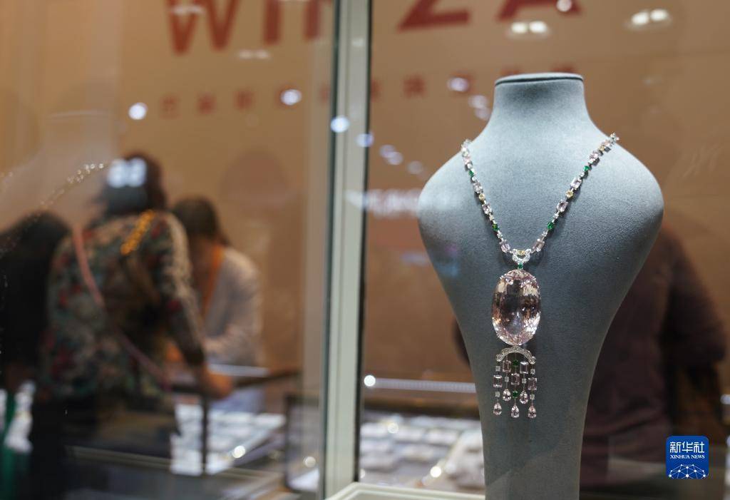 这是11月7日在第六届进博会消费品展区拍摄的巴基斯坦展商展示的摩根石吊坠项链。
