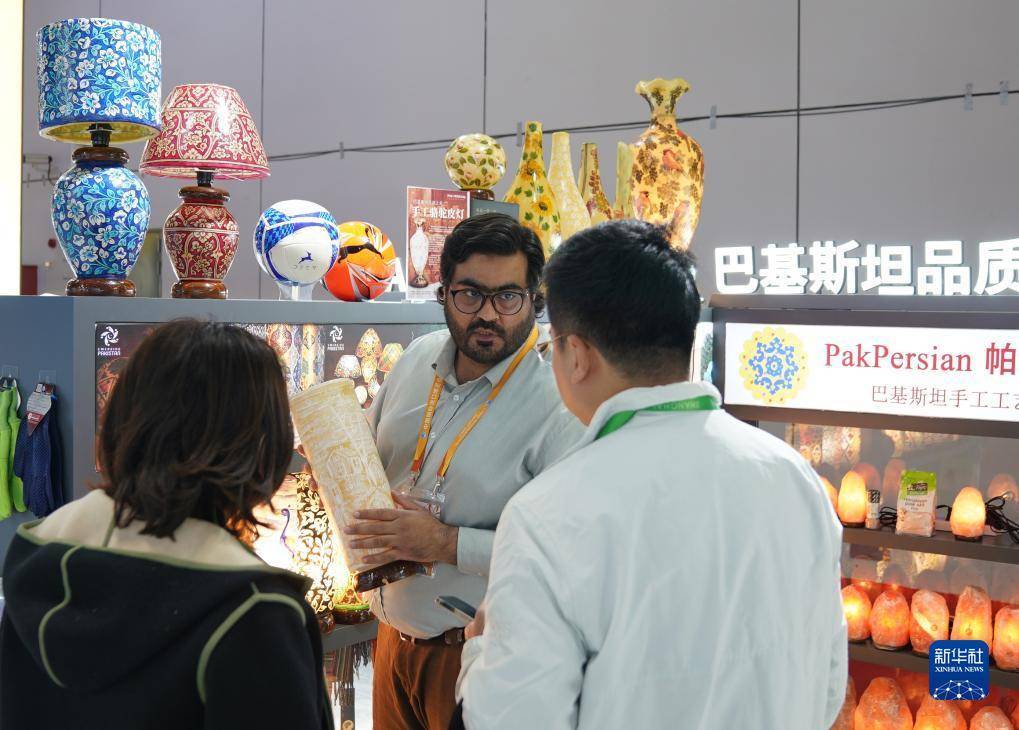 11月7日,在第六届进博会消费品展区,巴基斯坦展商展示骆驼皮灯。