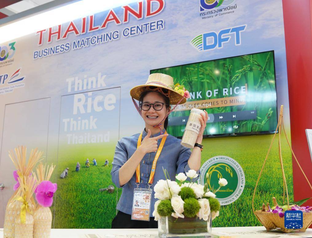 11月7日,展商在第六届进博会国家展泰国展台展示泰国香米。