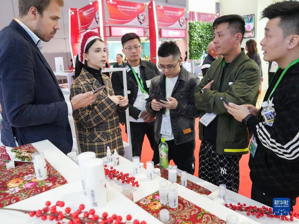 11月7日,在第六届进博会消费品展区,参观者在咨询来自俄罗斯的产品信息。