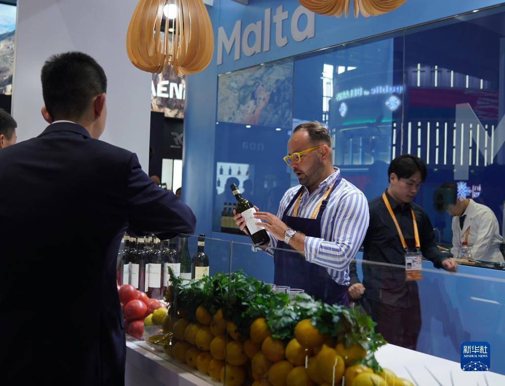 11月5日,展商在第六届进博会国家展马耳他展台介绍马耳他红酒。
