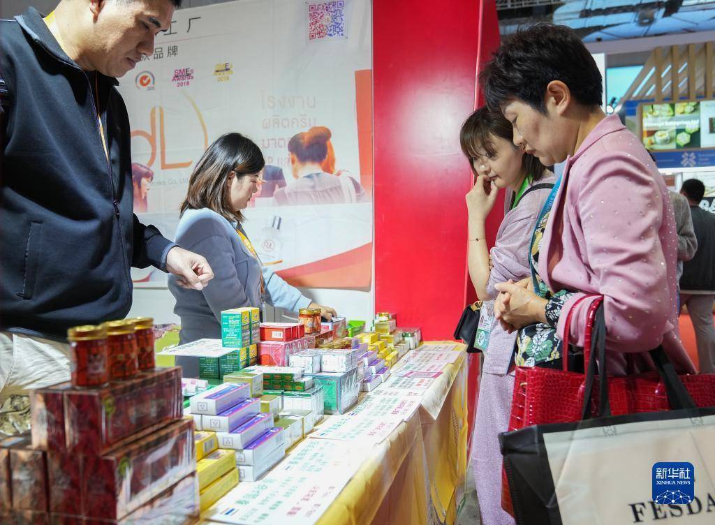 11月7日,在第六届进博会消费品展区,泰国参观者在咨询来自泰国的产品信息。