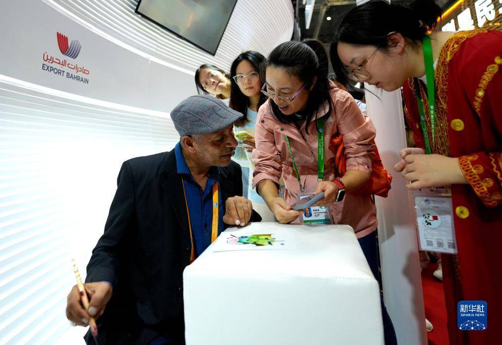 11月7日,在第六届进博会国家展区,巴林王国展台一位艺术家与观众互动交流。