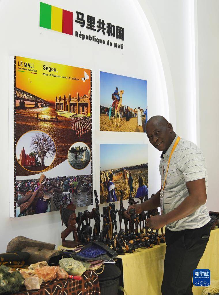 11月5日,在第六届进博会国家展马里共和国展台,展商在摆放展品。