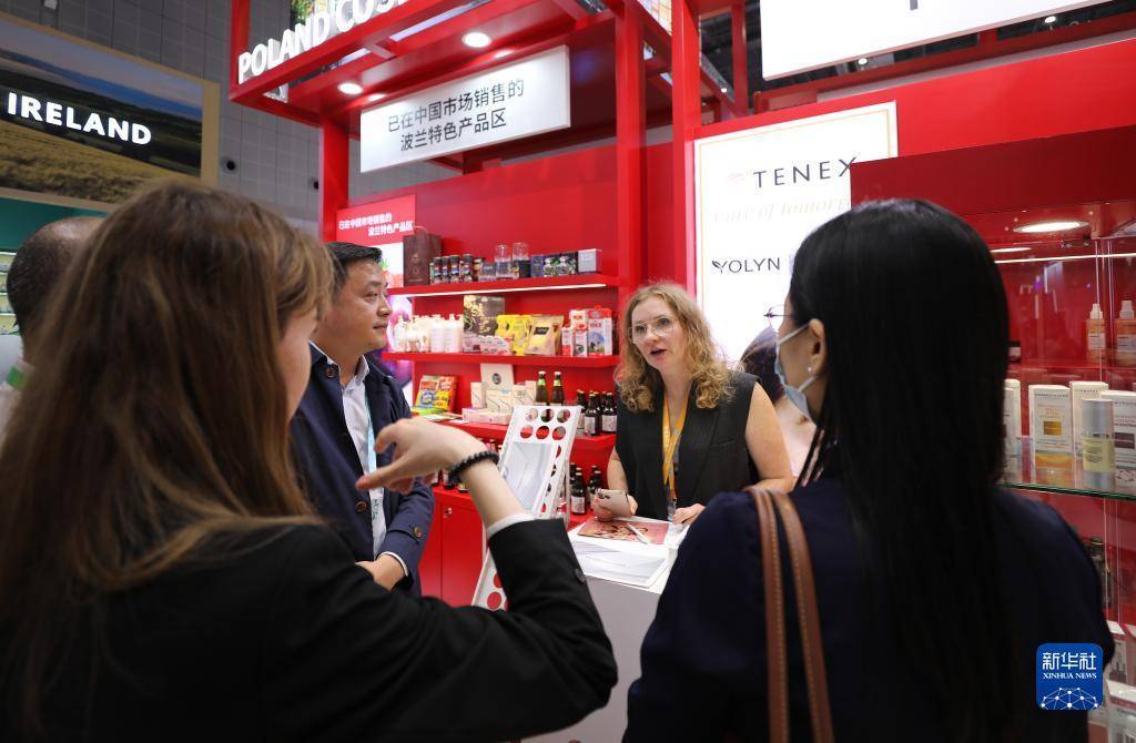 11月6日,在第六届进博会国家展波兰展台,参观者向展商咨询展品细节。