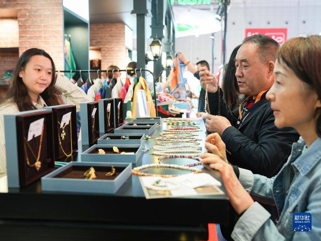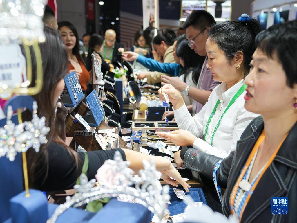 11月7日,在第六届进博会消费品展区,参观者在挑选来自格鲁吉亚的项链。