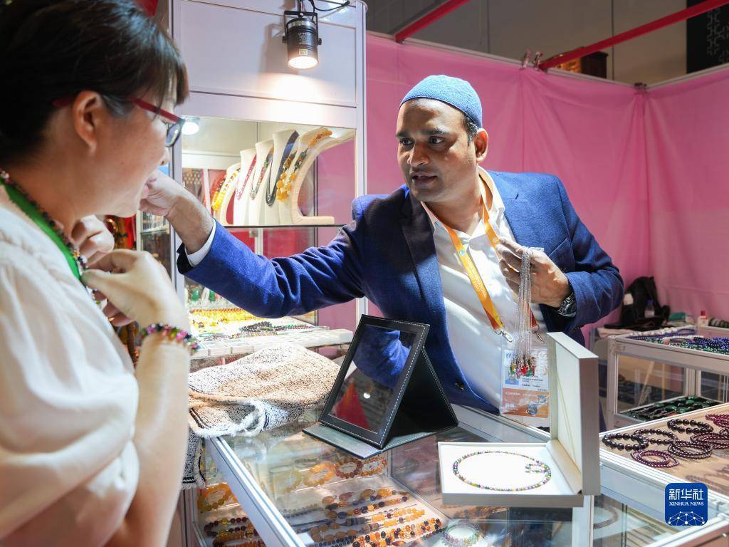 11月7日,在第六届进博会消费品展区,一名来自巴基斯坦的展商向参观者介绍项链。