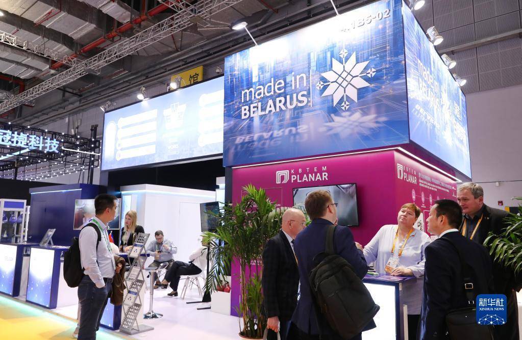 11月7日,参观者在第六届进博会技术装备展区的白俄罗斯企业联合展台与展方工作人员交流。