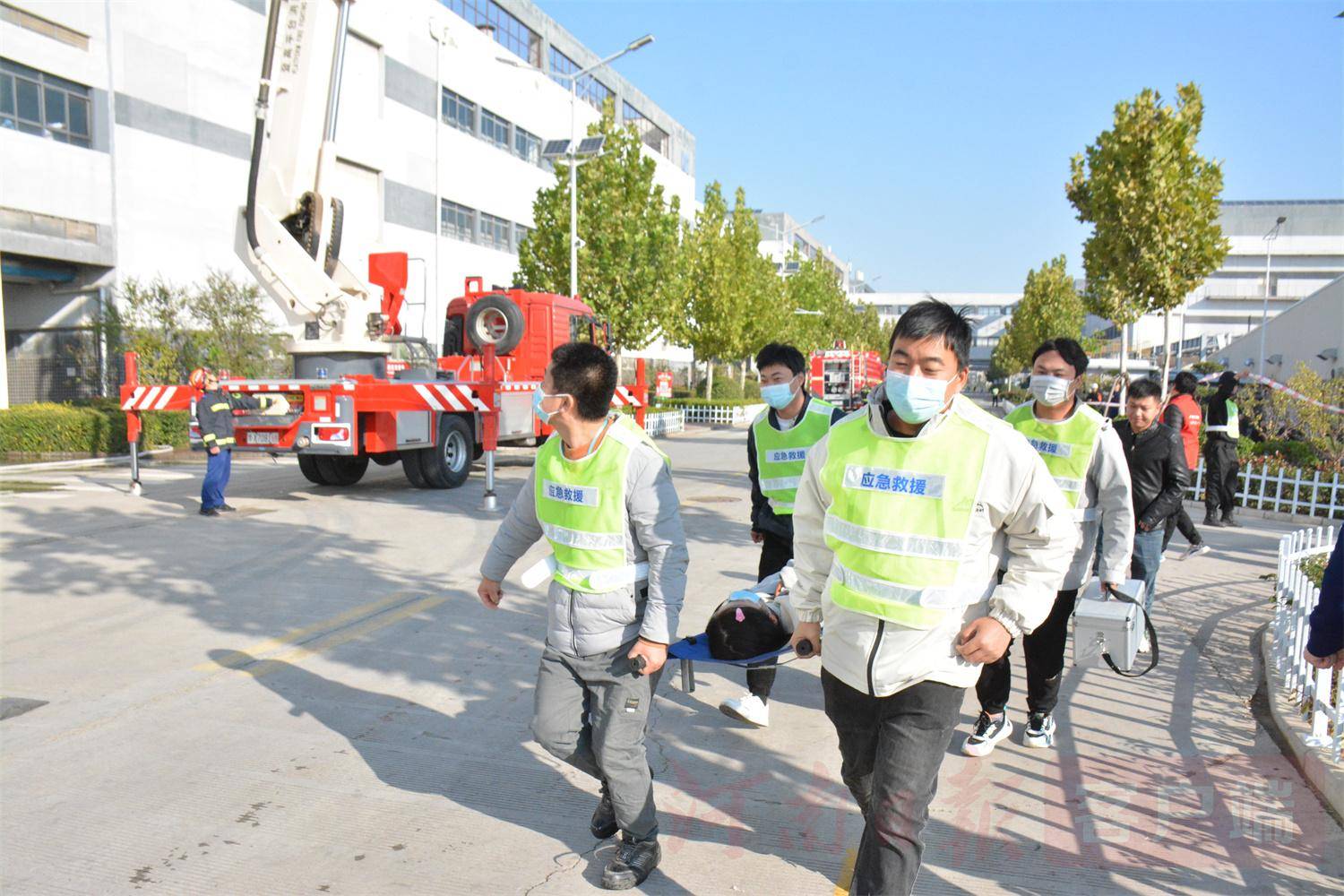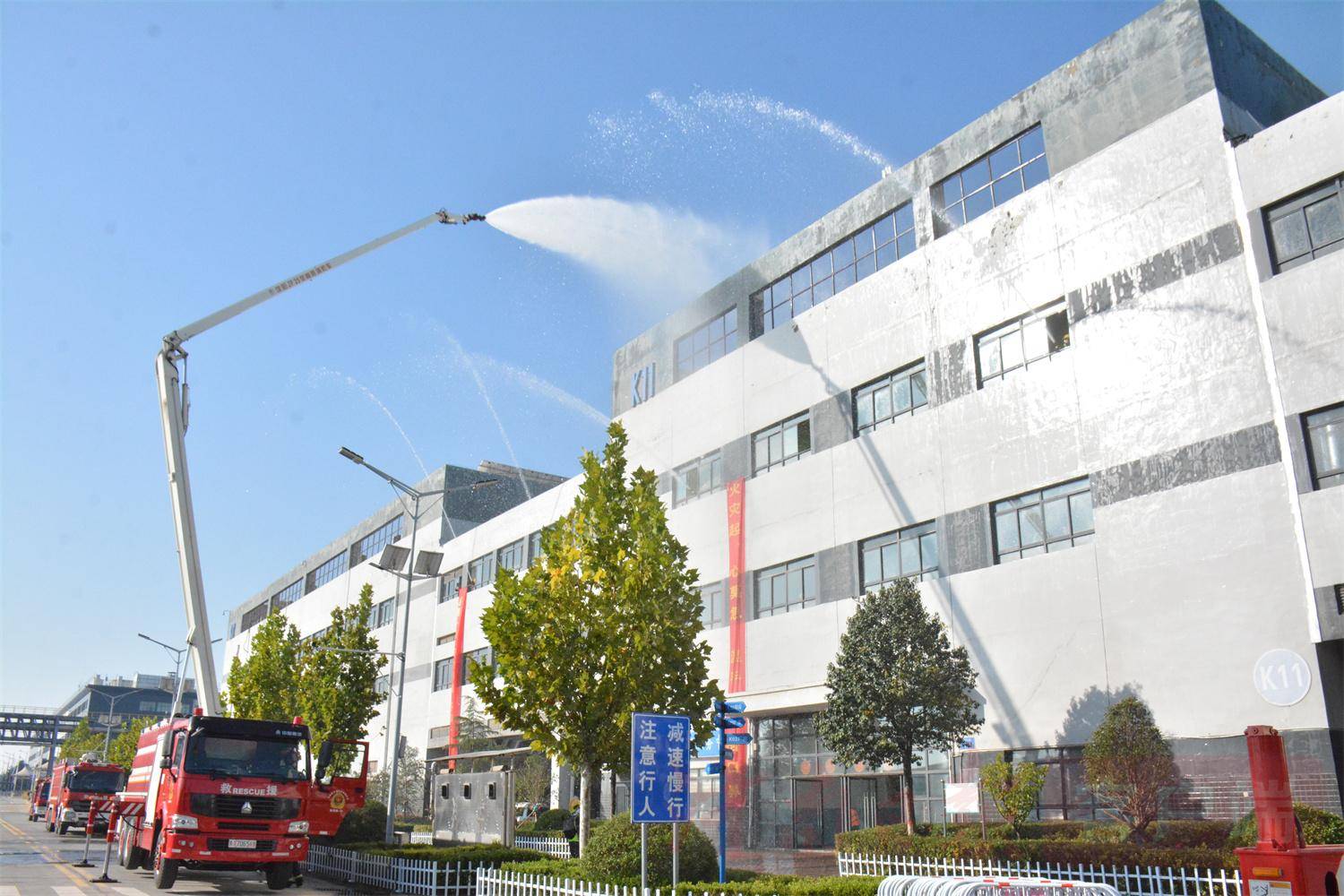 仪式开始,郑州航空港区消防救援支队联合富士康郑州科技园在综保区内展开一场千人灭火救援综合疏散演练。演练包括模拟楼层着火应急报警、人员疏散、消防车救援、烟雾逃生等众多场景。消防队员、多名志愿者和园区微型消防站工作人员各司其职,演练过程紧张有序。
