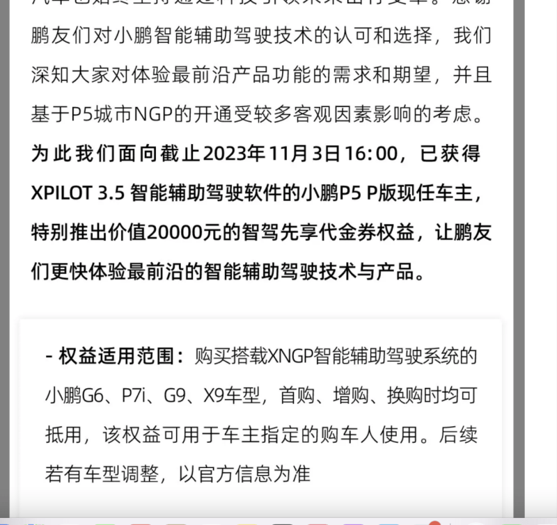 11月3日,针对数百位P5老车主维权事件,小鹏汽车发布《关于小鹏P5城市NGP功能升级的说明》,除了各种升级许诺外,小鹏汽车向车主推出价值2万元的智驾先享代金券权益。