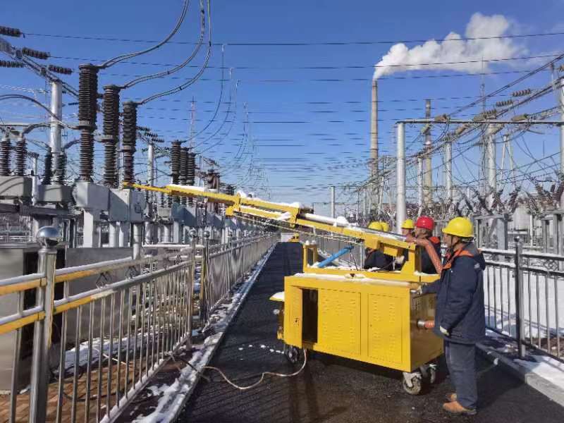 国网抚顺供电公司运维人员利用移动式融冰装置开展设备清雪工作。 (国网抚顺供电公司供图)