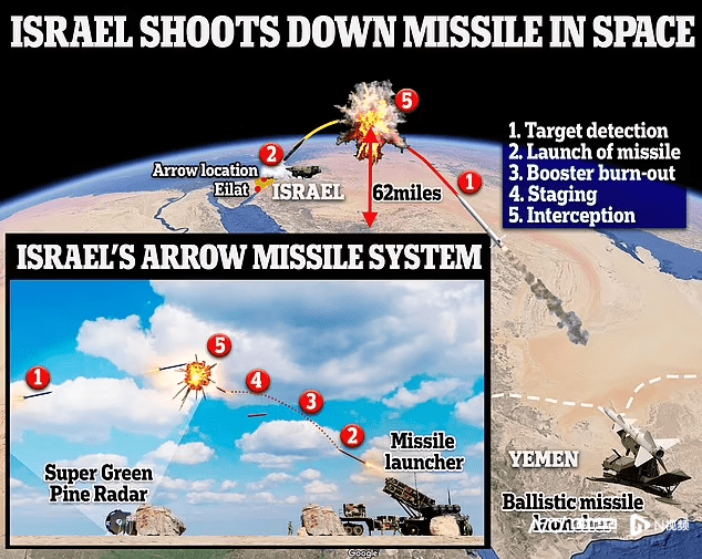 以色列国防军(IDF)表示,其“箭”式导弹防御系统在红海上空距离地表62英里(约100公里)处的地球大气层外击落也门胡塞叛军发射的一枚弹道导弹。IDF表示,这是自10月7日与加沙地带的巴勒斯坦武装派别哈马斯爆发战争以来首次使用该防御系统。